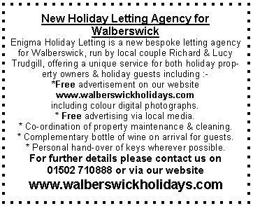 THE WALBERSWICK SCROLL --------------------------------------------------- The next showing of the Scroll will be in the Village Hall on Saturday 10th July, from 10.00 a.m. until noon. Many readers will be familiar with this extraordinary painting of the village produced in 1931 and 1932 by John Doman Turner. The video has found its way into many homes, but there's nothing like the real thing! I will be running it back and forth two or three times, so anyone who comes along should get a reasonable view of it. Richard Scott.