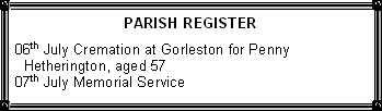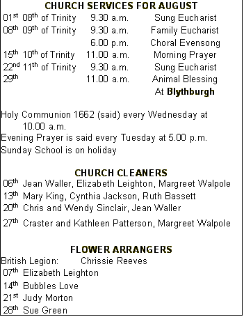 This time last year, I was enthusing about the glorious summer that we were experiencing; how things change in a year! At our diocesan clergy conference at Swanwick in June, the theme was 'Making the most of Change'. I found it reassuring to hear from a sociologist that things are changing at a much faster rate than at any other period in history - and I thought that it was just myself getting older! A few weeks ago, I met a visitor to the village who had last come here twenty years ago; he made the comment that, "Walberswick hasn't changed much". To some extent that may be correct, on the other hand, every time someone new moves here, there is inevitably change; hopefully of the positive kind. When you think about it, Disraeli was right when, in 1867, he said, "change is constant". Christians are assured in the New Testament that 'Jesus Christ is the same yesterday and for ever' (Letter to the Hebrews 13.8) so, whilst we might see changes happening all the time, we can be confident that our God is an unchanging God. Two dates to note; we shall be arranging a Luncheon Club in August, however, it will be on the third Friday, the 20th. Then, on Sunday 29th of September at 11.00 a.m., we shall be joining with the team at the annual Blessing of the Animals Service at Holy Trinity Church, Blythburgh. Yours in Christ's service, Brian Fisher