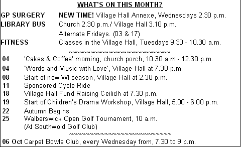 COPY PLEASE BY 8PM ON THE 15TH OF THE MONTH TO Tony Green, Winfield House, Stocks Lane,Walberswick, Southwold, IP18 6UJ. Tel 01502 722347 (9 - 9, MON - FRI) (villagenews@walberswick.net)
