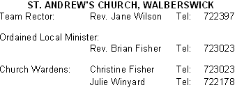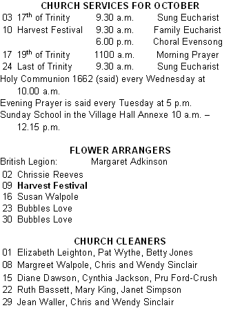 I would like to take the opportunity this month to say thank you to some people on behalf of St Andrew's Church. Firstly, to Julie Winyard for all the hard work that she put in to planning and running the children's holiday club in August. I understand that it was well attended. Secondly, a big thank you to Denise and Christine for planning and organizing this year's 'Rainbow' Village Fete. I think that everyone agreed that it was a very happy and successful occasion. I was well aware as to how much work they put into it; it is certainly not something that just runs by itself! The Village Fete is an event that raises much-needed funds for our village church and our village hall. As far as the church is concerned, some people may wonder what happens to the money raised in this way. A proportion of all monies given to our church go towards our diocesan quota, which in turn, enables clergy stipends and pensions to be paid. The diocese also provides our church with legal and general advice, as well as education and training for clergy and laity. After paying our quota, we then have the not inconsiderable responsibility of maintaining the general fabric of the church and churchyard. So, we are indeed grateful for the assistance provided by the Village Fete. Because we are having our Harvest Supper on 8th October, there will not be a Luncheon club this month.
