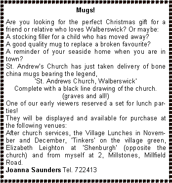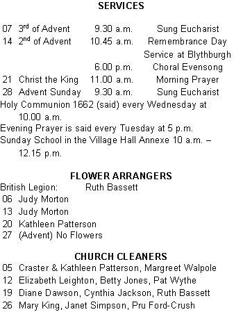 Many thanks to all those who made our Harvest celebrations such a success. Everyone seemed to agree that the Harvest Supper and the two Sunday services were very happy and joyful occasions. Although I was not at the Family Service in the morning, I understand that the young people who took part (not forgetting the trumpeter dad!), helped to make the service a really meaningful one. It is good to see so many getting involved - well done everyone. Please read Patsy Murray's notice, about the next Family Eucharist Service on 12th December. There are two services to which I would draw your attention. Our annual team All Souls Memorial Service will take place this year at St. Margaret's Church Reydon on Sunday 31st October, starting at 3.00 p.m. This is a service that gives people an opportunity to remember relatives and friends who have died in recent years. The other is our annual Remembrance Day service, which this year will be held at Holy Trinity Church Blythburgh, on 14th November, commencing at 10.45 a.m. The monthly Luncheon Club will be on Friday 12th November, 12.30 p.m. in the Village Hall. I do not like giving too much notice about things that are happening near to Christmas, but, because of the success of last year's December Luncheon Club, we shall have to ask people to book in advance for this year's extravaganza (?) - it will take place on Friday 10th December.