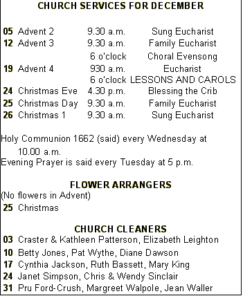 Yes, Christmas is rapidly approaching once again - is it me or does it seem to arrive earlier every year? Due to the popularity of the Crib Service last Christmas Eve, we are going to repeat it, but at the later time of 4.30 p.m., thus enabling Patsy to zoom from an earlier service at Blythburgh to be able to play for us. I am hoping to involve children (and some willing parents) in the service. Over the Christmas period there will also be services at 9.30 a.m. on Christmas Day & Boxing Day (a Sunday this year). Prior to Christmas we shall be celebrating the season of Advent. The Sole Bay Team, lead by the Revd. John Mockford, will be holding a Quiet Morning at Reydon Church Room On Saturday 11th December (10.00 a.m. - 12.30 p.m.) to which everyone is invited. Don't forget the Christmas Luncheon Club on Friday 10th December at 12.30 p.m. in the Village Hall. The cost, as usual, will be £5, and will include a glass of wine and other extras! It is not too late to book for the lunch. Let me close this letter with a verse from a poem by Tom Krause: 'The meaning of Christmas is not about presents or just having fun but the gift of a father - his own precious Son so the world would be saved when his work was all done.' May God bless you and grant you a happy and peaceful Christmas.