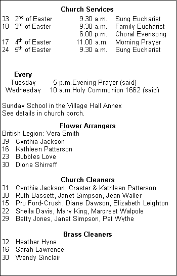 As I sit at my computer it feels as though spring has arrived and that winter is on the way out. Soon we shall be welcoming more visitors to the village, many of whom will have been here before, some for whom it will be a first time experience. Let us all endeavour to make them feel welcome in the village generally and in our church particularly. After giving way to the Lent Lunches during the past two months, our monthly Luncheon Club will resume on Friday 1st April, 12.30 p.m. in the Village Hall. As ever all are welcome. The Annual Parochial Church Meeting will be held in St Andrew's Church on Thursday 21st April at 7.30 p.m. I mentioned in my letter in the February Village News that the Sole Bay Team were to have a Confirmation Service on Sunday 15th May. Unfortunately, due to our diocesan bishop being indisposed on that date, the service has had to be postponed to the autumn - watch this space! You may have heard, read or seen in the media information about the 2005 Make Poverty History campaign, whereby charities, church organisations, trade unions, and campaigning groups have united to persuade the UK government to get tough on worldwide poverty. If anyone is interested in joining me, I am going to a meeting about this campaign (organised by Tearfund) at St Andrew's Church, Ipswich, on 28th April, and could offer you a lift. Yours in Christ's service, Brian Fisher.