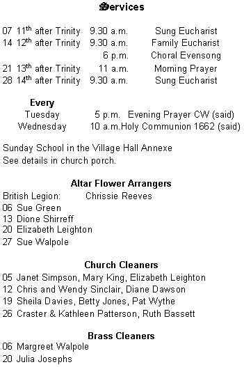 Here is a sample of the positive comments in our church visitor's book made by visitors during our recent Flower Festival weekend. (9th, 10th July) 'To the glory of God indeed! I've really enjoyed the beauty and variety of the floral displays. And appreciated the organ playing and highly polished brass too!' (Dunlop, Scotland) 'Beautiful flowers and church' (New Jersey, USA) 'A lot of thought put into it' (Wigston Magna) 'Blooming wonderful display' (Honiton) 'The beauty reflects God's glory' (Bedford USA) 'So creative' (Purley) Indeed, thanks to all the helpers, adults and children, who helped to make the weekend so enjoyable and successful. Special thanks to Elizabeth Leighton for organising the festival - it was her first would you believe? Thanks, also, to those who assisted in providing music, and to those who helped by being on duty at the various stalls. The annual Scripture Union Beach Mission (the old CSSM) will take place at Southwold between 31st July and 12th August; please see the church notice board for further details. During the week beginning 8th August Julie Winyard will be running a children's holiday club in the village. The annual Blessing of the Animals service will take place at Holy Trinity Blythburgh on Sunday 28th August at 11 a.m. Our next Luncheon Club will be at the Village Hall on Friday 12th August at 12.30 p.m.; as usual everyone is welcome and the cost will be £5. Yours in Christ's service