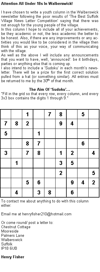 This may not become a regular feature, although a few people have mooted the possibility, however, as the web-site is slowly becoming more used, and more user friendly, more email post is arriving! For any of you minded to 'drop a line' about anything to do with the village, or otherwise, please do. No guarantees as to whether you'll see your name up in lights--but we'll do or best. (The word 'politics' was even mentioned!) Whilst on the subject of websites, email et al, my thanks to all of you who have posted photographs, which now appear on the electronic version of the Newsletter. You know who you are better than I do, as they arrive anonymously. There are some really fabulous pictures so ,please do keep them coming!