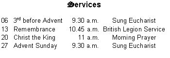 A big thank you to all those who helped to make our recent Harvest celebrations such an enjoyable time; a weekend full of thankfulness to God for all the good things that he has provided for us. Our village hall and our church were both beautifully decorated. The gifts of vegetables, fruit, and canned goods that were generously given have either been distributed within the village, or have gone to The Fyffe Centre at Lowestoft. Congratulations are due to our team rector, Jane Wilson, who has been appointed an honorary canon of our diocesan cathedral. I have no doubt that this is in recognition of all the hard work that she has put in for the team and for the deanery. She is to be installed in her seat at the cathedral by Bishop Richard on Sunday 20th November at Evensong (3.30 p.m.). A coach has been arranged for people wishing to attend - please let me know if wish to be there. Our team Confirmation Service, which was postponed from earlier in the year, is to take place at St Edmund's Church, Southwold on Tuesday 22nd November at 7.30 p.m. Bishop Richard will be presiding at that service. Our monthly Luncheon Club takes place on Friday 11th November at 12.30 p.m. - all are welcome as usual. Advance notice: the Christmas Luncheon Club is to take place on Friday 9th December at 12.30 p.m. - it will be necessary to book for this one.