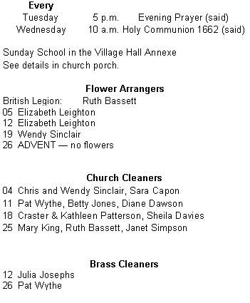 I should like to give thanks to all those who made this year's Harvest Festival such a successful weekend. First of all, to Brian and Christine and their helpers for such an enjoyable harvest supper. To all who donated fruit, flowers, vegetables, and provisions. Finally, to all my hard working and inspired band of flower arrangers, who helped to decorate the church so beautifully.