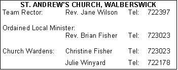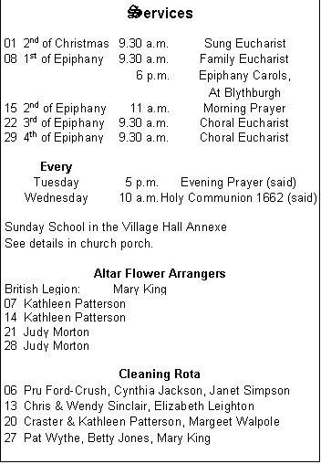 Another year has passed and here we are in 2006 - it seems only yesterday that we celebrated the Millennium. The Roman poet Virgil wrote words that echo in my mind: 'But meanwhile it is flying, irretrievable time is flying.' If you are in the habit of making New Year resolutions perhaps it would not be unreasonable to resolve to make time for other people, a bit of loving your neighbour as yourself. You may feel that as a village community we are quite good at looking after each other but it would not hurt each one of us to go even further along that road. If you feel unable to help someone but feel concerned about them please do not hesitate to contact me, or one of my clergy colleagues, if you think that somebody in the village might appreciate a visit. You may have heard that the December Luncheon Club was an excellent event thoroughly enjoyed by all. May I reiterate that the Luncheon Club is for anyone in the village - it is not just for senior citizens! Our next lunch will take place on Friday 13th January 2006, at 12.30 p.m. in the Village Hall: the cost is £5. Please note that there will not be a Choral Evensong service in St Andrew's during January; instead, we shall be joining Holy Trinity Blythburgh for their Epiphany Carol service on 8th January, at 6.00 p.m. With every blessing for 2006,