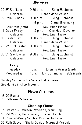 Easter: what thoughts does the word, the season, conjure up for you? Easter bunnies perhaps? Or, more likely, Chocolate Easter eggs? Or do you think about the real reason for celebrating Easter i.e. the fact that Jesus Christ rose triumphantly from the dead? If you want to know more about that, why not join us for our service on Easter Sunday morning? Before we arrive at the celebrations for Easter there will be further events to help you understand something of what Christians believe. The final meeting of the Lent Group will take place at Greengates on Tuesday 4th April at 7.30 p.m., when we will endeavour to answer the question 'Where is God when we try to make sense of life?' The final two Lent Lectures at the United Reform Church in Southwold will be: Sunday 2nd April 'Sanctification - Holier than thou?' By the Venerable Geoffrey Arrand. Sunday 9th April 'Reconciliation - love even my enemy? By the Revd Keith White. On Maundy Thursday a Team Eucharist with foot washing (the latter is not compulsory, a few token volunteers act as a very powerful visual aid as we remember Jesus Christ washing his disciples' feet) will take place at Holy Trinity Blythburgh at 7.30 p.m. The following day, being Good Friday, there will a one-hour devotional service here at St. Andrew's, as we think about Jesus Christ's crucifixion. May you enjoy a happy Easter, Brian Fisher