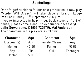 The Walberswick Film Club will recommence on Sunday, 17th September. Our inaugural season was so successful, that we shall hope to show eight films during the 2006-7 winter months for the same subscription as last year - £12.00. By popular demand we shall continue our showings on Sundays, but we are moving to the third Sunday of each month, with the exception of December. Posters will be displayed and members kept informed of our choices, together with the appropriate synopsis by email and snail-mail. Thank you all for being so supportive. Our first film will be West Side Story directed by Robert Wise and starring Natalie Wood, Richard Beymer, George Chakiris and Rita Moreno. The story of Romeo and Juliet has been updated to the 1950s and set in New York's Upper West Side. The star-crossed lovers are from feuding street gangs, the Anglo Jets and the Puerto Rican Sharks. The innovative choreography of Jerome Robbins and infectious score by Leonard Bernstein and Stephen Sondheim combine to set our toes tapping and hearts singing along with songs such as 'America', 'Tonight', 'I feel Pretty', 'Gee Officer Krupke', 'Maria', etc. Subscriptions: £12 to Kay Ungless at Winton, The Street (near The Tuck Shop) Entrance: Members £2, guests £4 and non-members £5: guests and non-members are limited to two showings in the year. West Side Story (Cert PG): 7.30 p.m. Sunday, 17th September 2006 in the Village Hall. Kay Ungless Tel: 01502 722655 email: ungless@aol.com